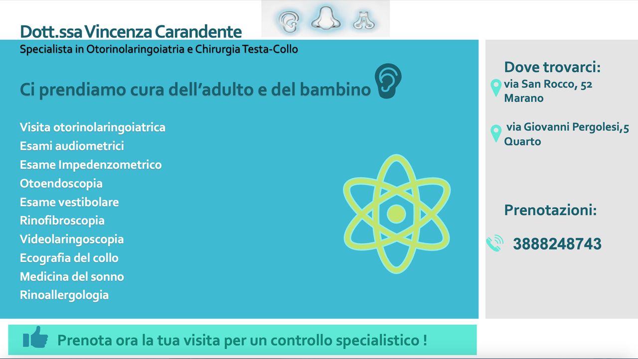 Sono la dott.ssa Vincenza Carandente - Medico Chirurgo Specialista in Otorinolaringoiatria (ORL). Dopo la laurea in Medicina e Chirurgia con il massimo dei voti presso Università degli Studi di Napoli Federico II e Iscrizione all’Albo dei Medici Chirurghi di Napoli ho conseguito la specializzazione in Otorinolaringoiatria con Lode presso Università Vanvitelli di Napoli.